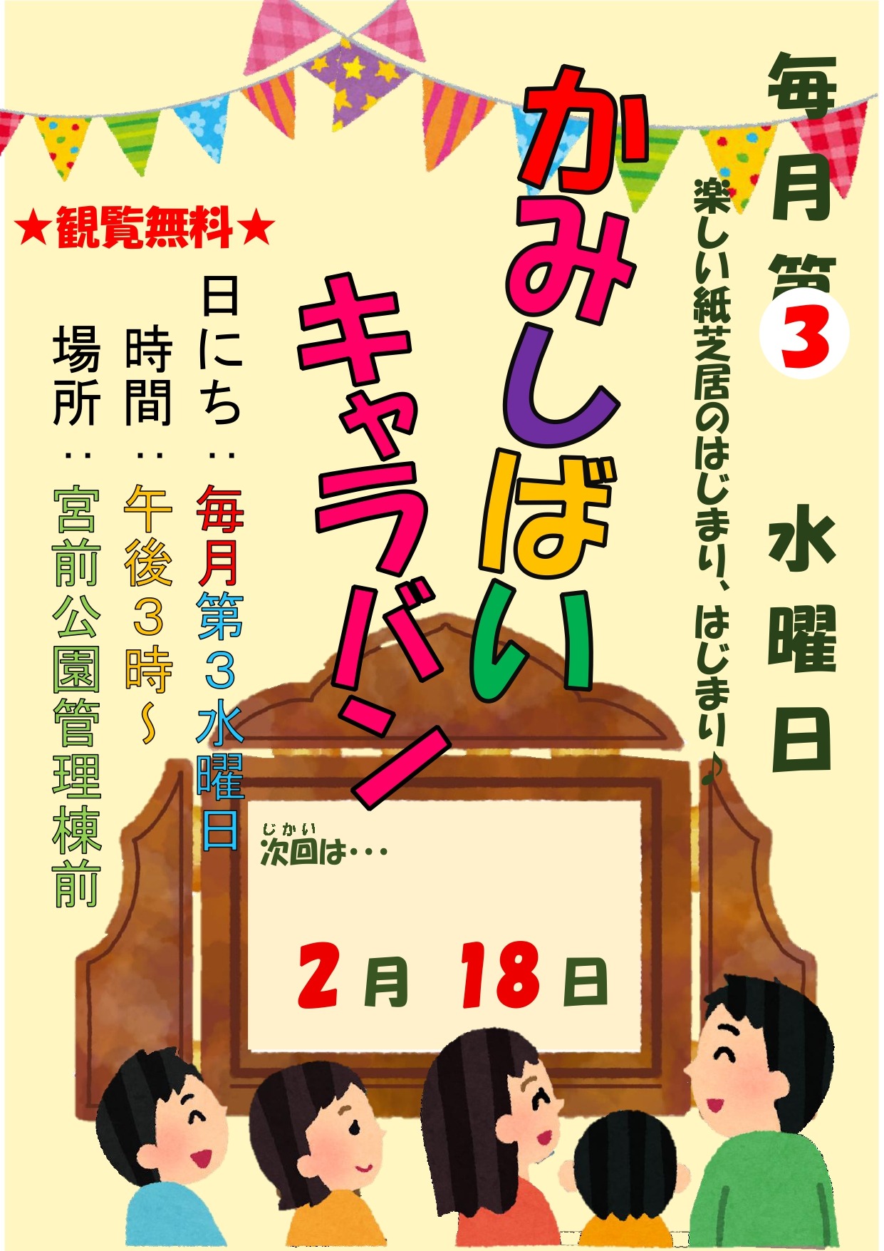※《公園の行事イベント》の関係や《夏季の高温時》、《冬季の寒冷時》および《荒天等》で、中止する場合がございます。 ※開催時間中、誰でもご視聴いただけます。