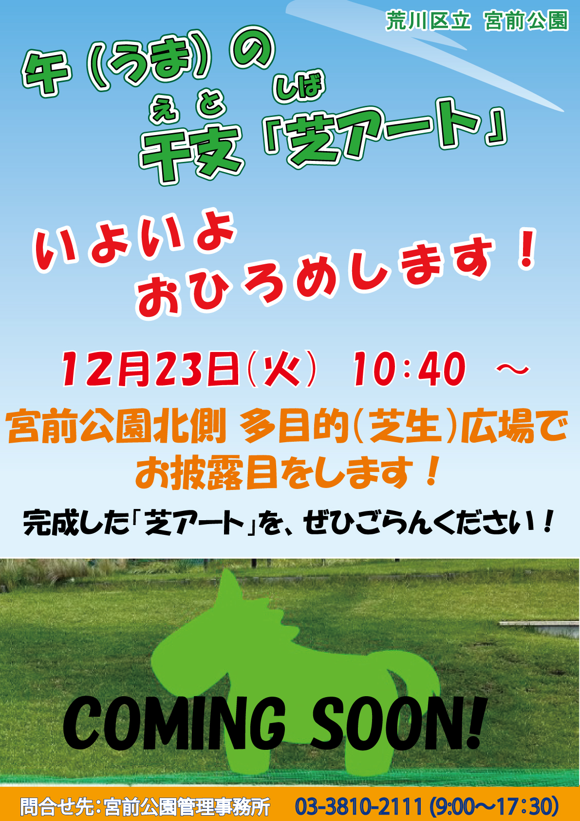 冬でも緑の芝生を使って、来年の干支を芝で描く「干支芝アート」いよいよ12月23日よりお披露目します! 場所は、北側の多目的広場の斜面(昨年と同じ場所です)