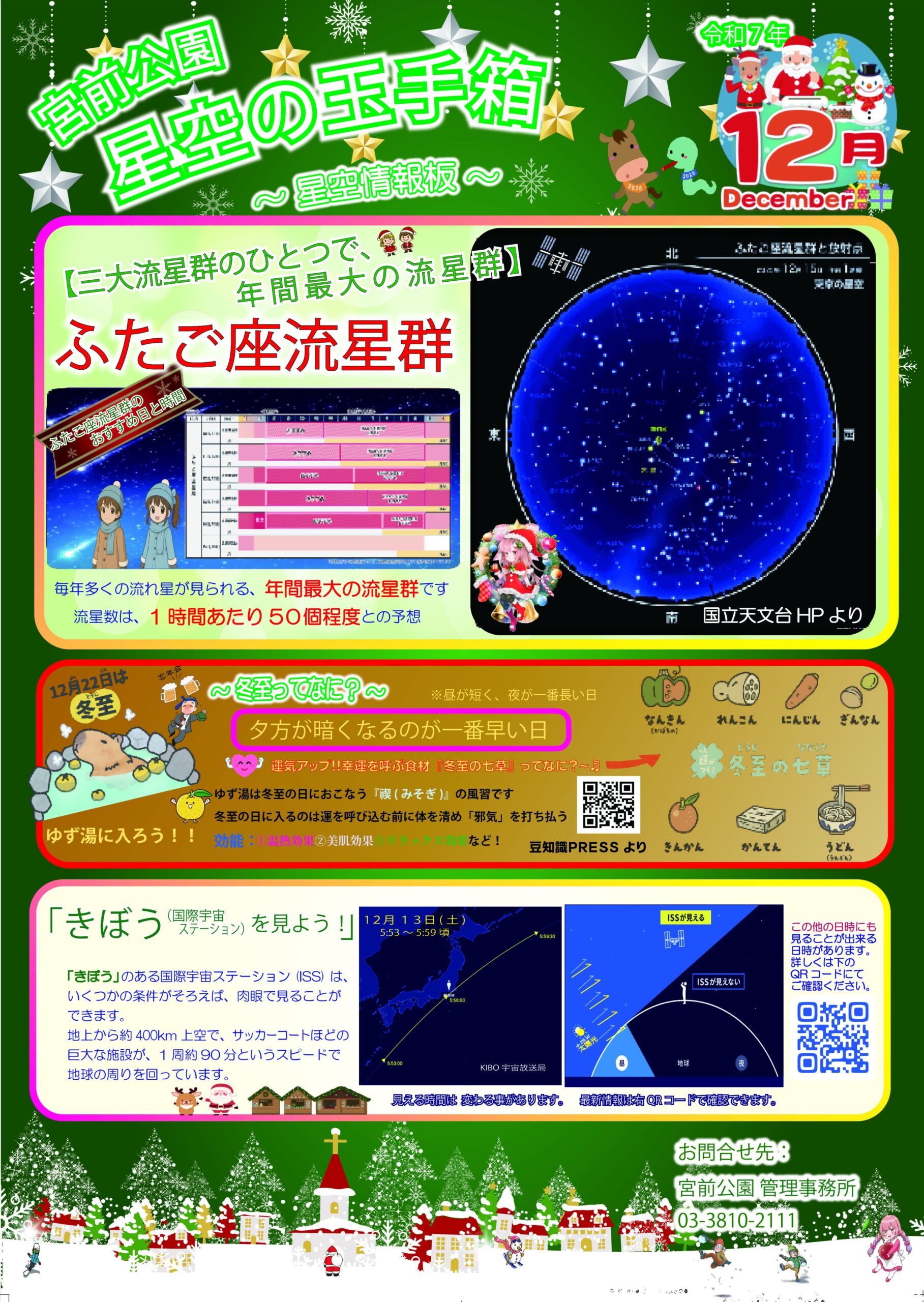 12月のトピックスは①今年最大の流星群『ふたご座流星群』情報🌟、②冬至の基礎知識⛄ です♬ 12月は多くのイベントとともに、星空の素敵な天体ショーを楽しむことができます♪♪