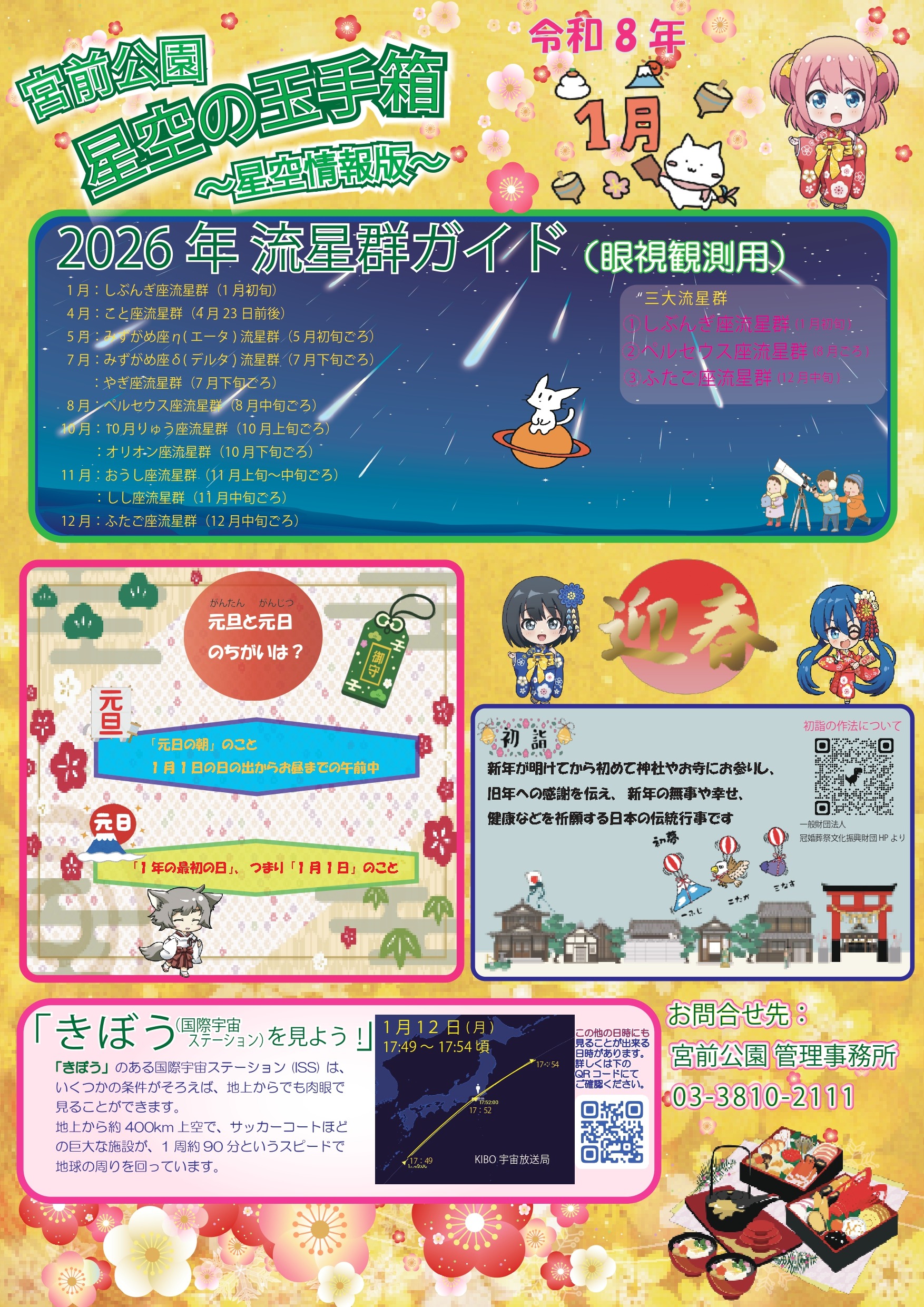 1月のトピックスは①2026年の流星群の情報ガイドです。🌟、②元旦と元日の違いってわかる?🌅? などです♬ 1月は星空以外に、多くのイベントが目白押し!!また今月も星空の素敵な天体ショーを楽しむことができます♪♪