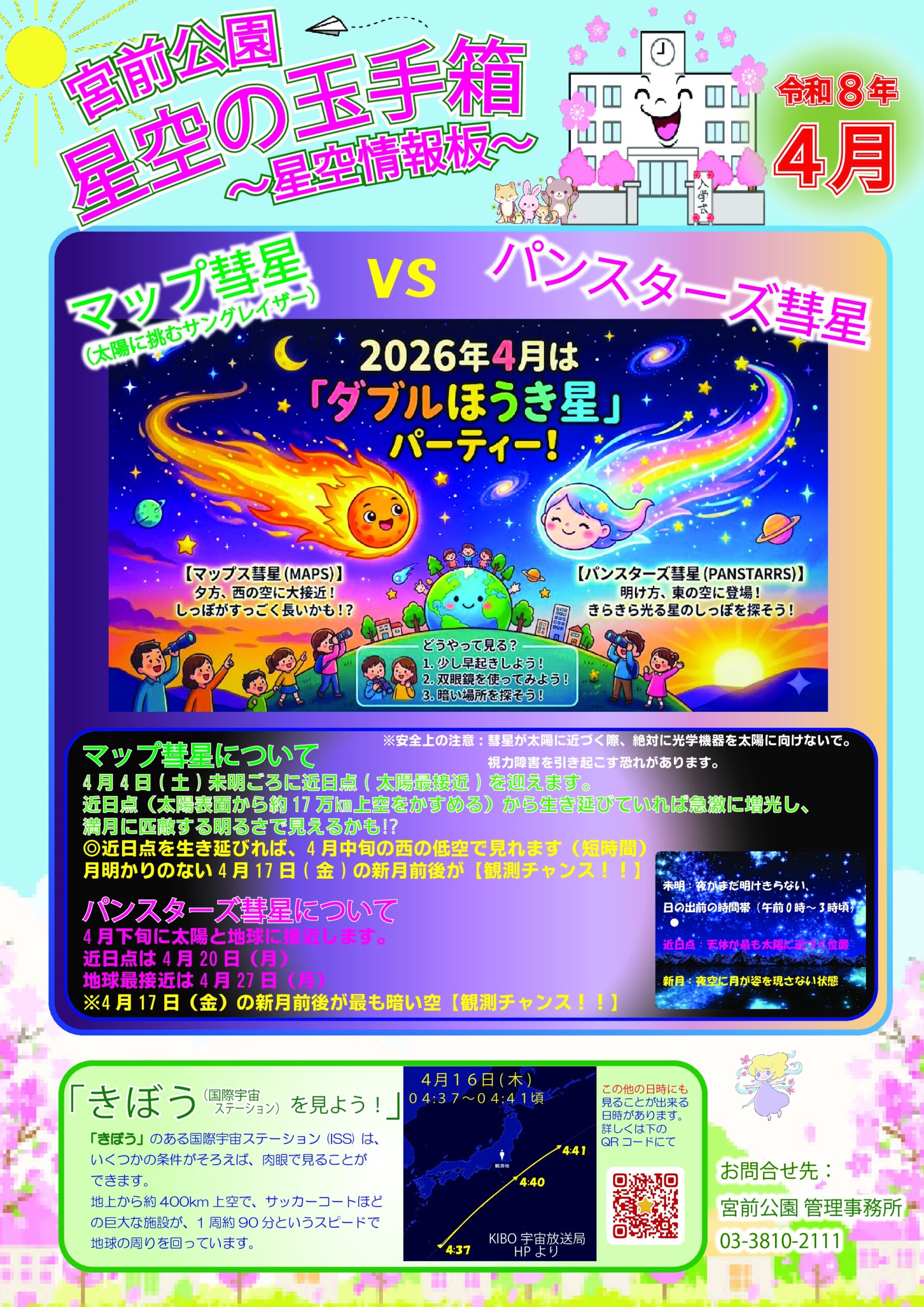 荒川区内でも比較的空が開けている宮前公園では、毎月星空に関する情報をまとめた「星空の玉手箱」を作成しております。