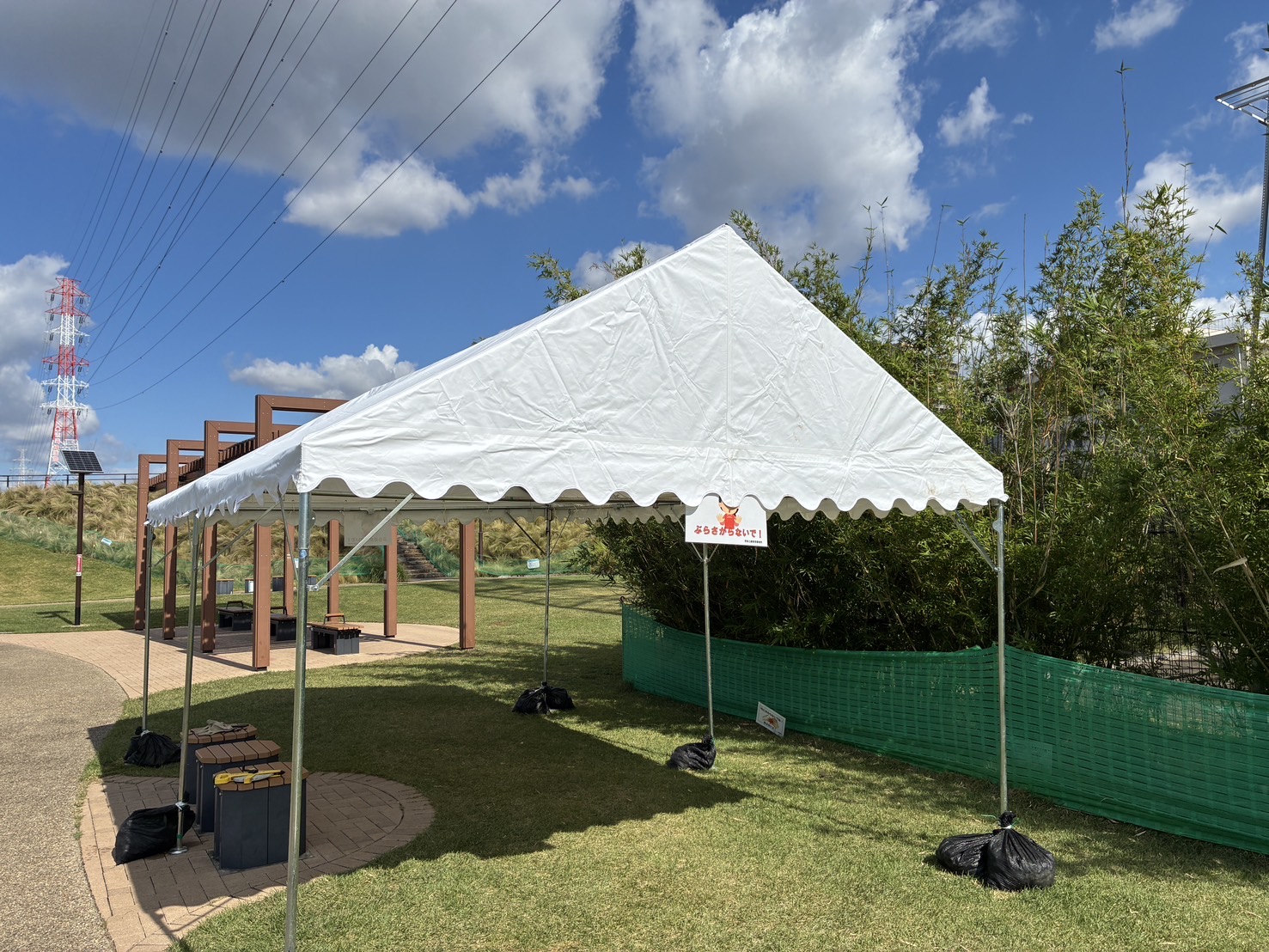 まだまだ日中、日差しが強い日もありますので、公園内、北側「多目的広場」に日よけテントを試験的に設置しています。 ※強風やイベントを開催する関係で急遽撤去する場合があります。 ※柱にぶら下がったりしないでください。