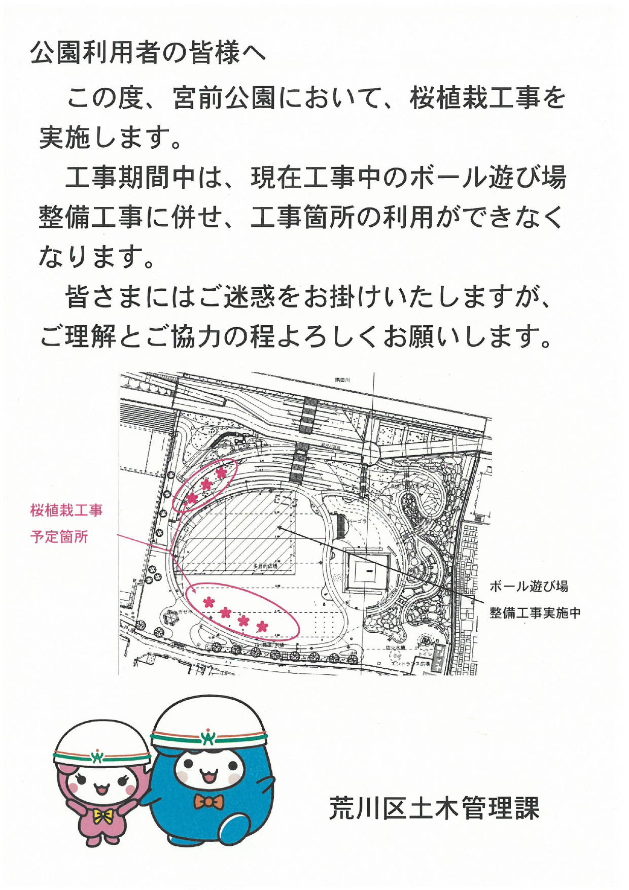 宮前公園北側にあります多目的広場(芝生広場)において、桜(さくら)の植栽工事を2026年1月15日(木)から実施いたします。 工事期間中はボールあそび広場と併せ、工事個所の利用ができなくなります。 工事期間中、みなさまにはご迷惑おかけいたしますが、ご理解とご協力のほどよろしくお願いいたします。